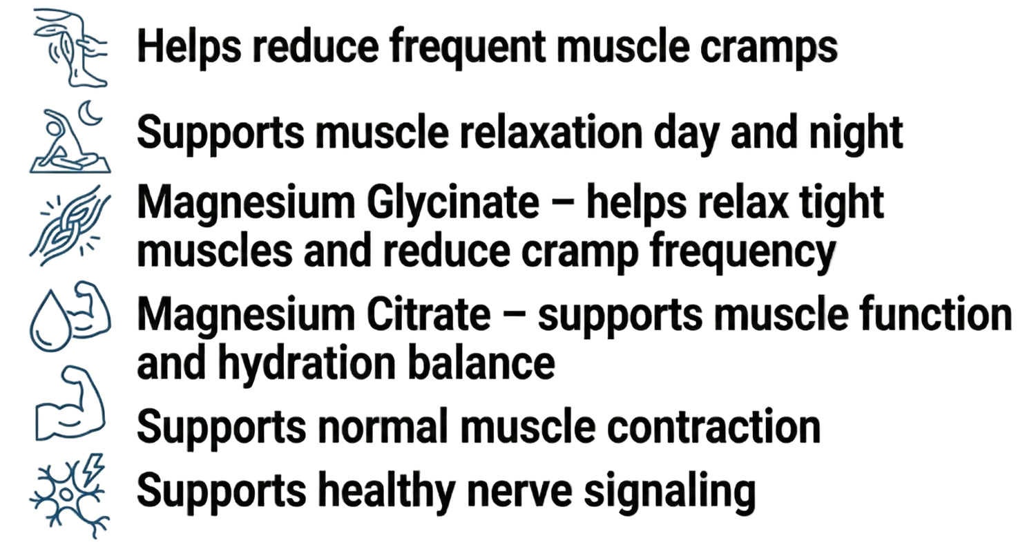 This combination is designed to support muscles day and night, especially for people who experience recurring cramps, tightness, or foot discomfort.